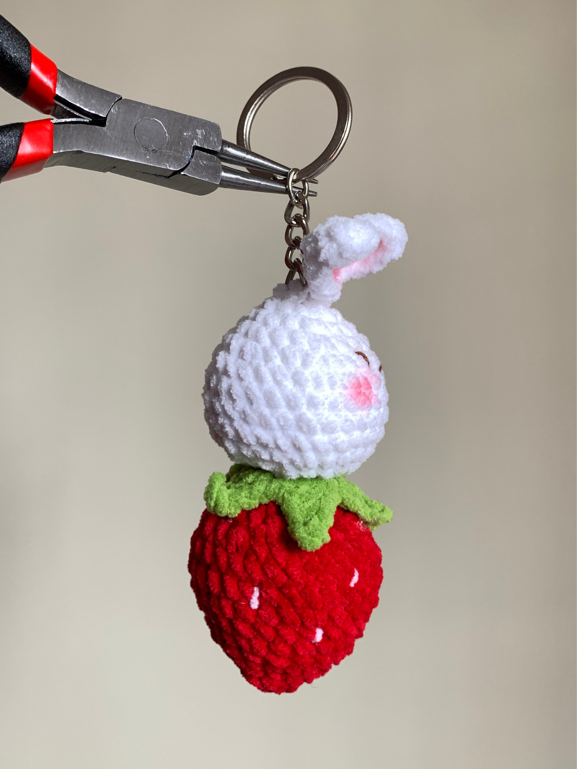 Bring home the charm of handmade cuteness with our Bunny with Strawberry plushie keychain! Soft, durable and carefully crafted, this plushie adds a playful touch to your bag,keys or gift collection.Perfect for anyone who loves accessories.