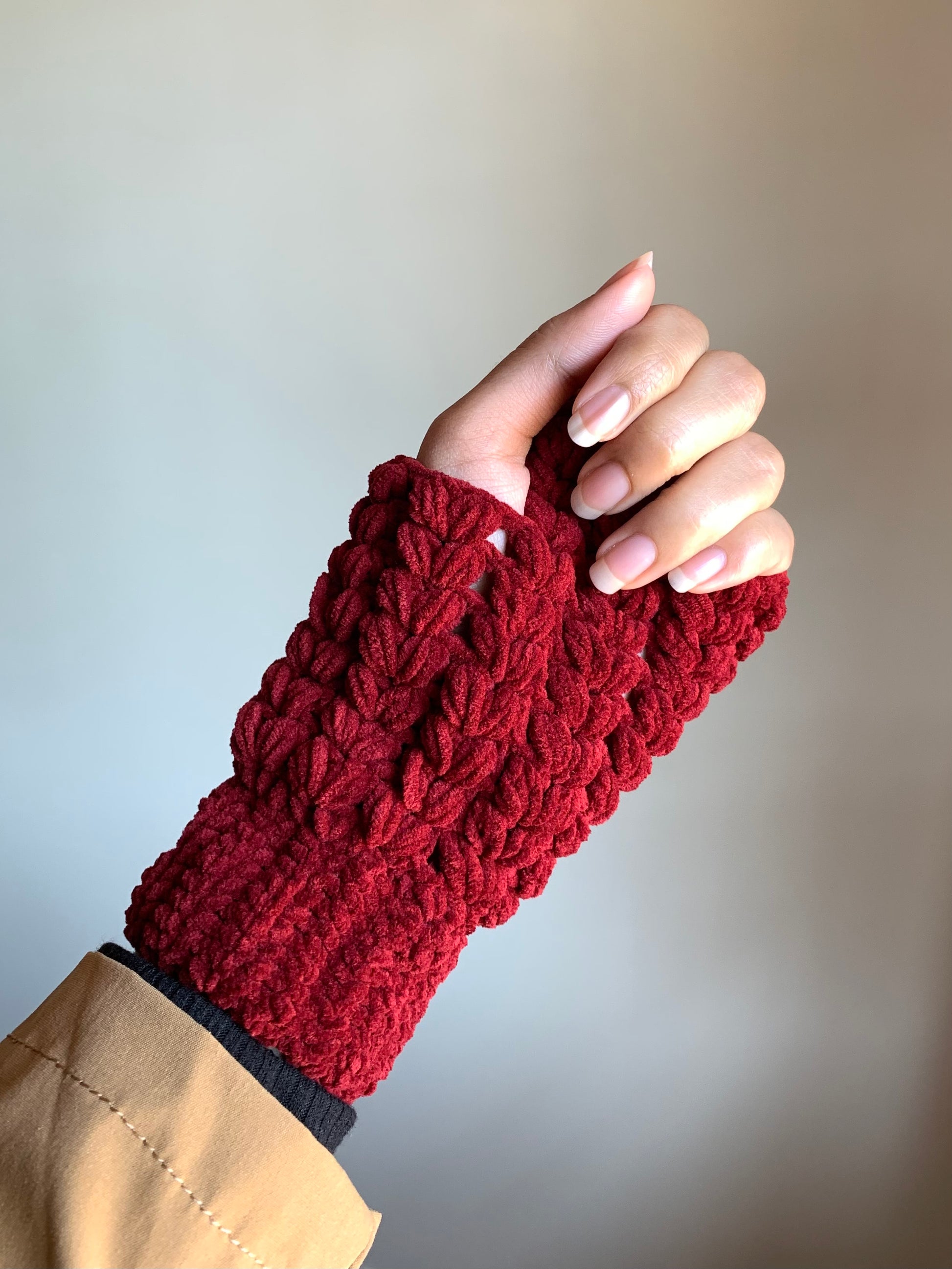 Mikasa Scarf In Deep Maroon Plush Yarn with Puff Heart Arm Warmers